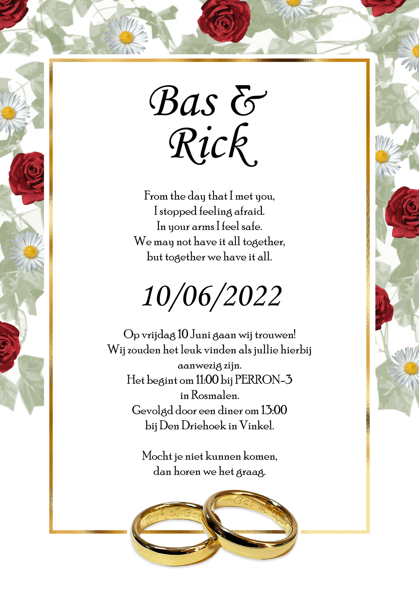 Voor de bruiloft van mijn vader was ik gevraagd om de uitnodigingen te maken. Hiervoor heb ik elke gemaakte stap besproken met mijn vader en zijn man en heb ik aanpassingen gemaakt op basis van hun feedback.